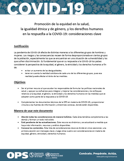 Promoción de la equidad en la salud, la igualdad étnica y de género, y los derechos humanos en la respuesta a la COVID-19: consideraciones clave